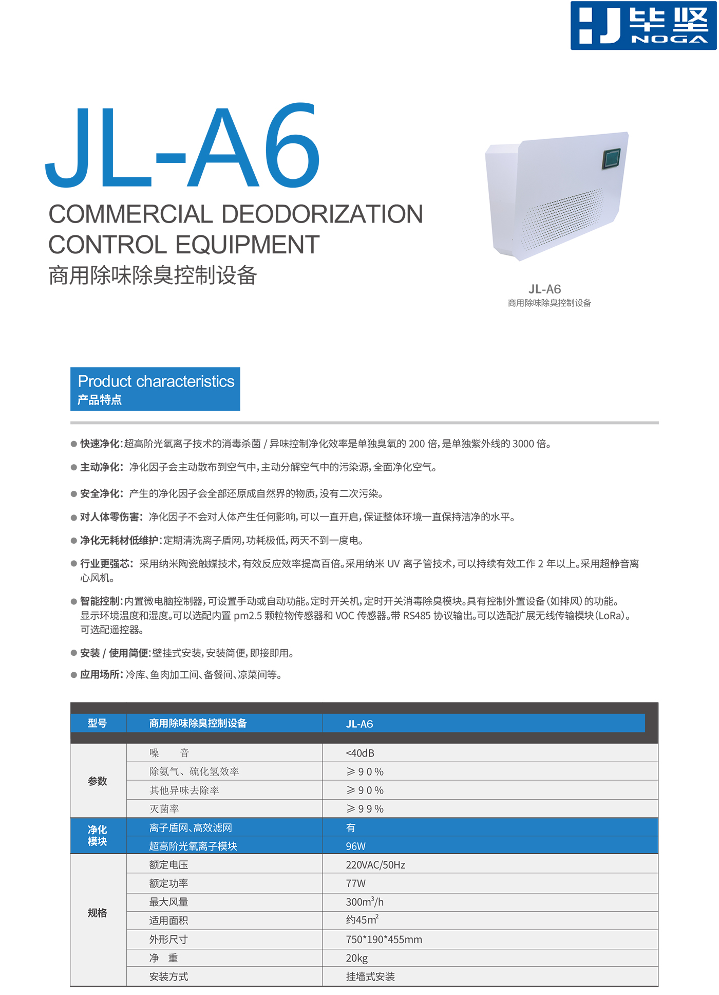 毕坚 JL-A6 是一款专为商业场景设计的高效除味除臭设备,主打超临界光等离子技术,除味、硫化氢及其他异味净化率均达 90% 以上,灭菌率更是高达 99%,净化效率是单独臭氧的 200 倍、紫外线的 3000 倍。