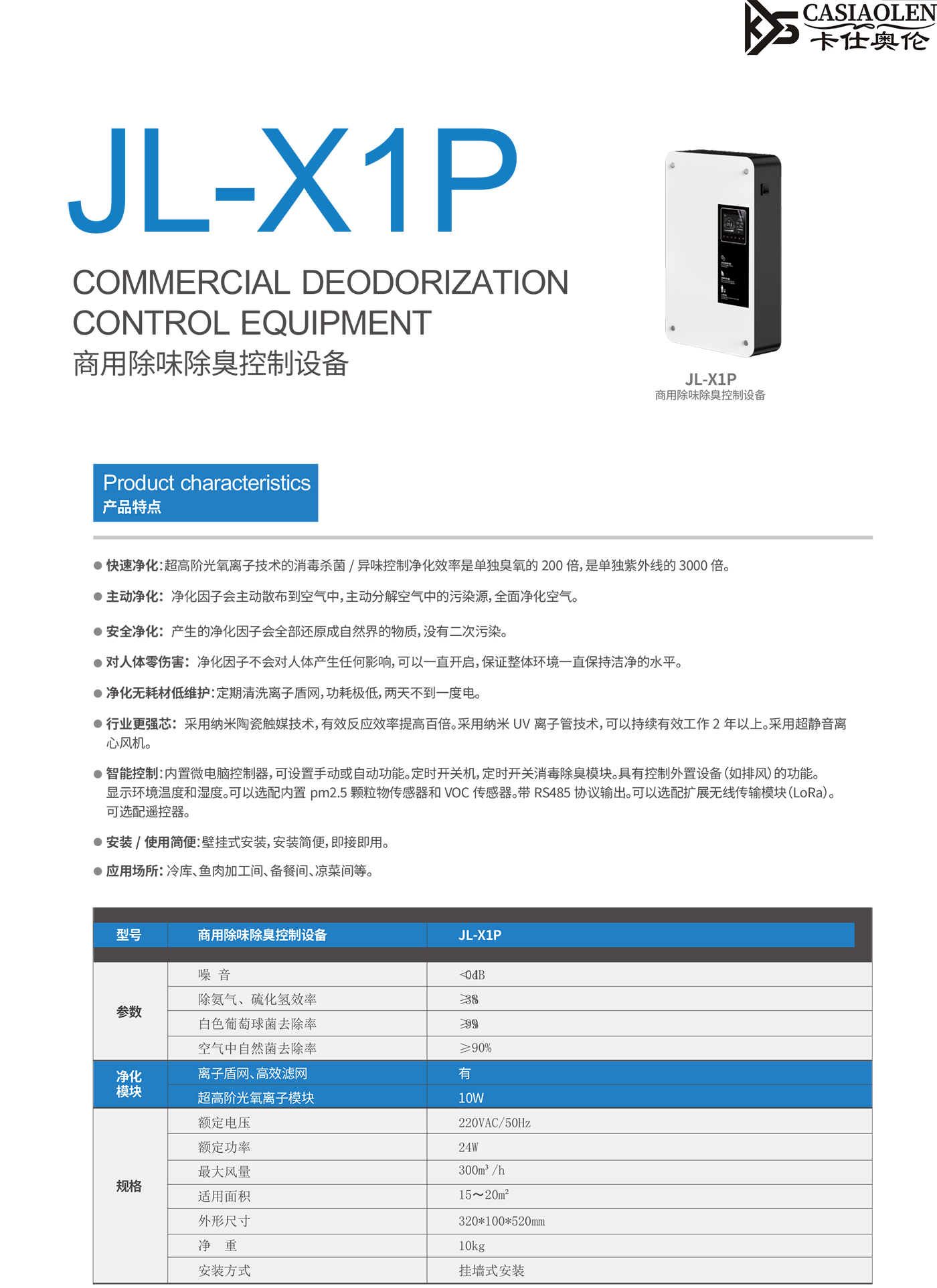 卡仕奥伦 JL-X1P 是一款专为小型商业空间设计的高效除味净化设备,核心采用超临界光离子技术,除臭、硫化氢等异味去除率≥90%,白色葡萄球菌去除率≥98%,净化效率是单独臭氧的 200 倍、紫外线的 3000 倍。