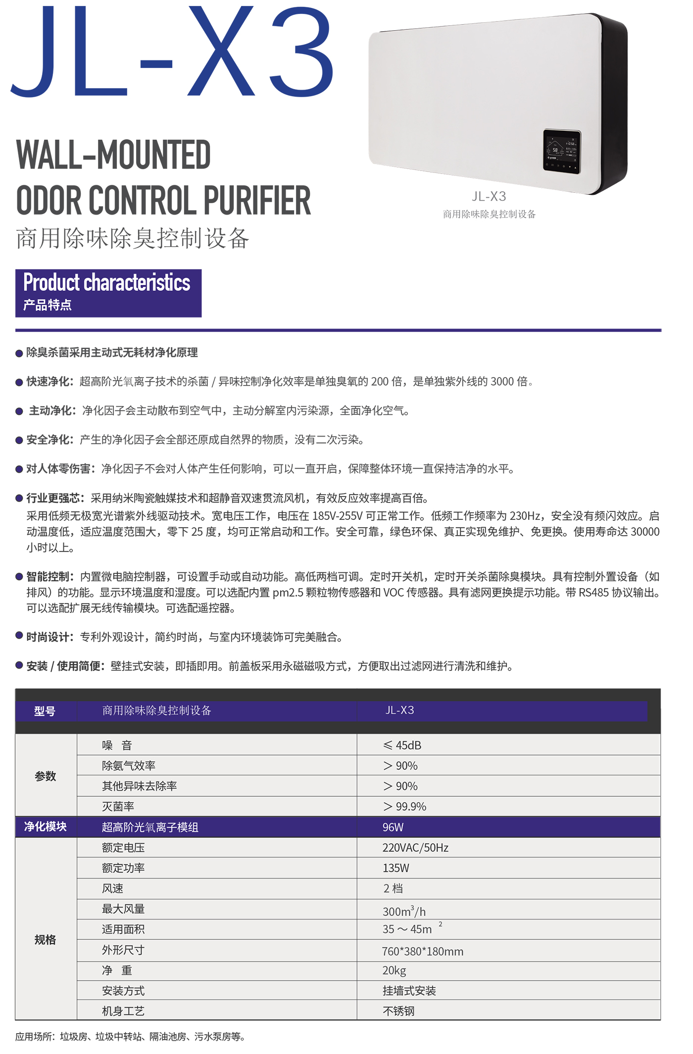 毕坚 JL-X3 是一款壁挂式商用除味除臭设备,主打 “主动式无耗材净化”,专为垃圾房、垃圾中转站、隔油池等场景设计,是高效、安全的空间异味治理方案。