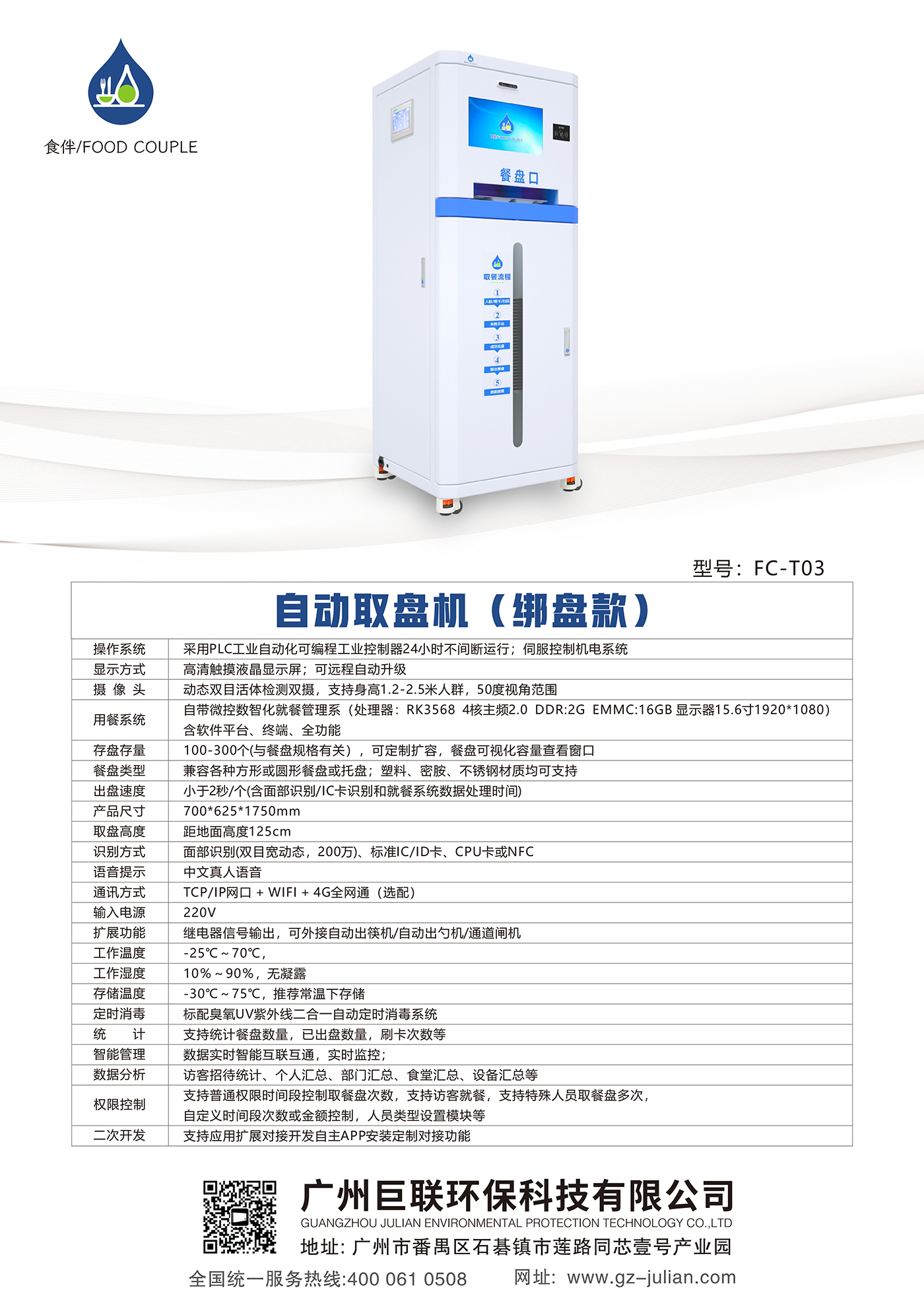 食伴 FC-T03 是广州巨联环保推出的主打食堂精细化餐具绑盘管控的智能取盘设备,适配需实现餐具与用户绑定、精准管理的食堂场景,集 “绑盘数字化管理 + 高效取盘 + 智能管控” 于一体。
